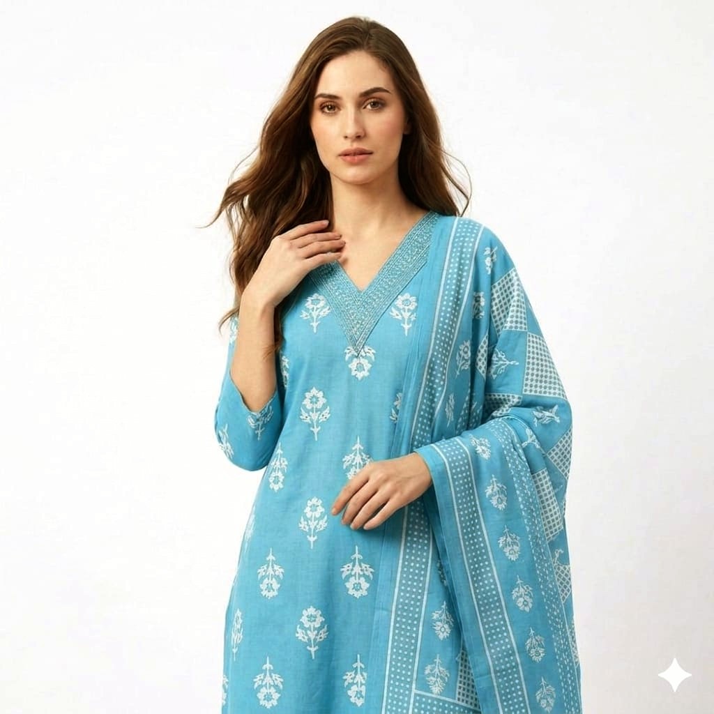 V-Neck Batik Dress Set with Dupatta